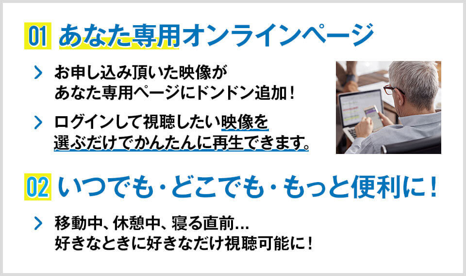 - ※本サービスはスマホ・タブレット閲覧専用サイトにログインして頂き、閲覧サイト上からご視聴頂くサービスとなります。
