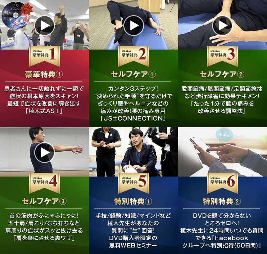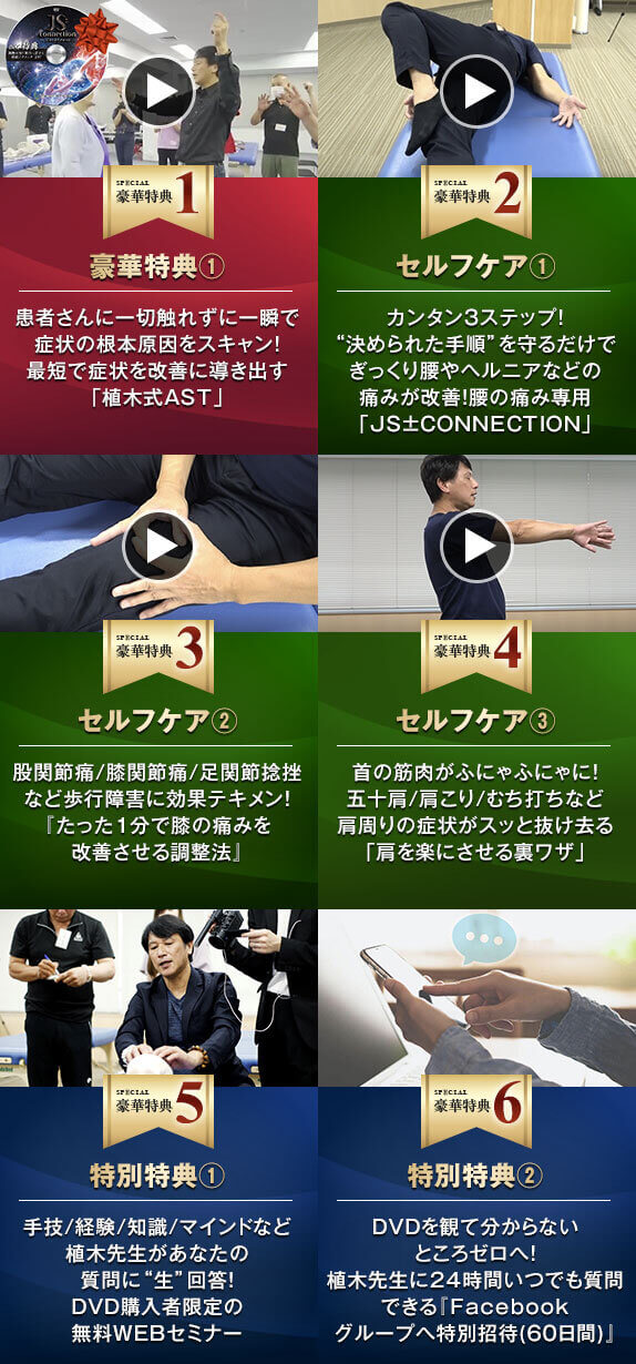 今回、1人でも多くの先生に『JS±CONNECTION』をお届けし、その真髄を味わっていただきたく、私たちは42,600円という破格のお値段でDVDを提供させていただくことにしました。植木先生から直接対面で学ぶことはできませんが、DVDを見てマネするだけで、あなたも手技を習得し、植木先生と同様の治療効果を出せるようになるでしょう。