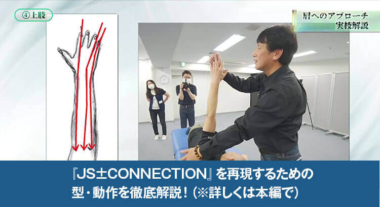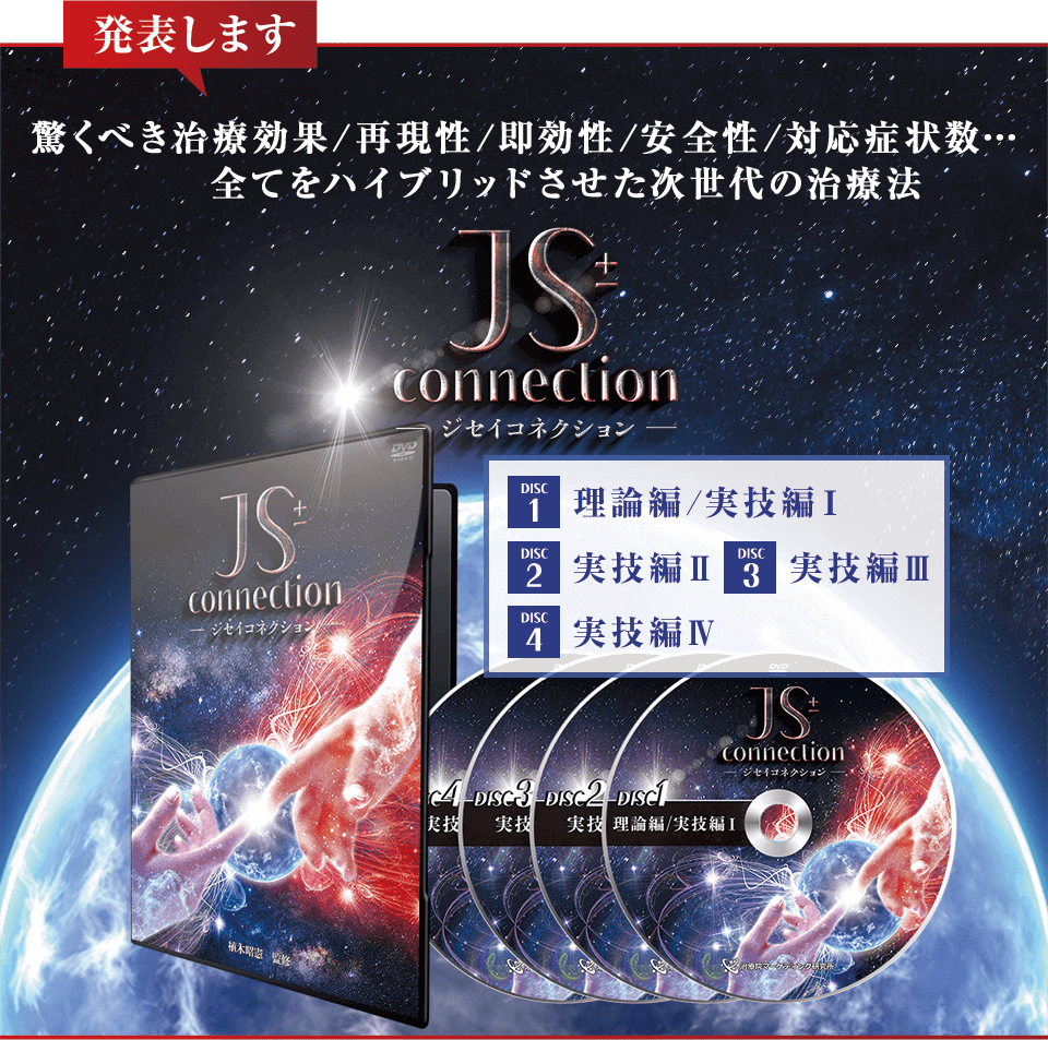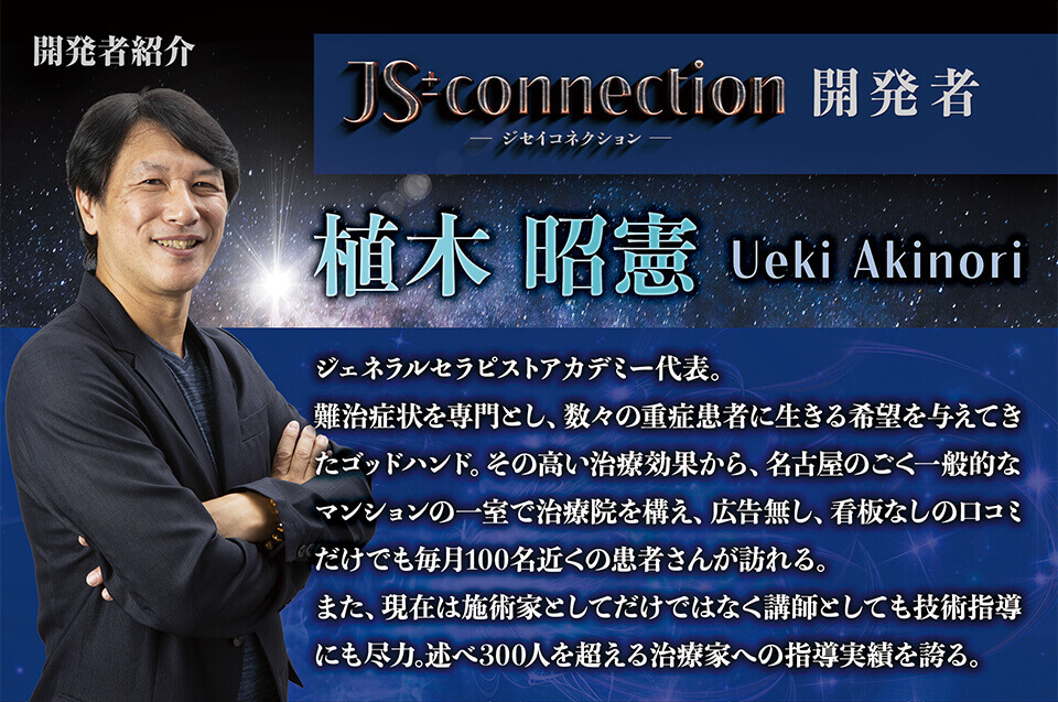 本DVDに収録された手技は、植木先生が難治症の患者さんと日々向き合う中で、生きることさえ諦めてしまうような患者さんを救いたい、そのような想いから開発されたものです。そして辛く苦しんでいる人を救えるこの治療法を全国の人に知ってほしい、みんなが大切な人を救えるようになってほしいという気持ちからこの治療法を公開することを心に決めました。だからこそ、筋肉の名前を知らない主婦の方でも確実に再現できるように自分のテクニックを究極的にシンプルに落とし込んで簡単にできるように体現化しました。それがこの『JS±CONNECTION』なのです。