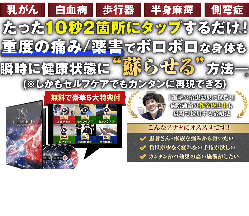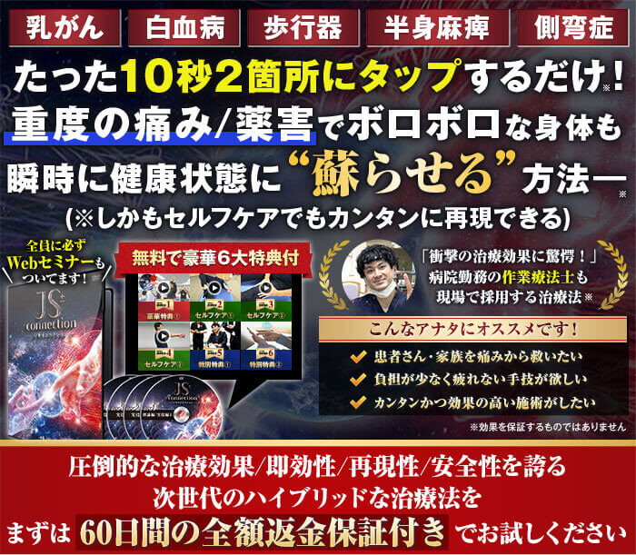 ですが、この『JS±CONNECTION』はあなたにとって重症患者さんを瞬時に健康状態に蘇らせる「魔法」のような存在になり得ます。それは、植木先生が数々の臨床結果や、看板なし・広告無しの完全口コミで全国から患者を殺到させたこと、病院勤務の作業療法士が愛用していることなど、あなたが今まで臨床で抱いていた疑問の答えや、ほぼ全ての患者様に、最大限の治療効果を出すための指針を示してくれる可能性が高いからです。